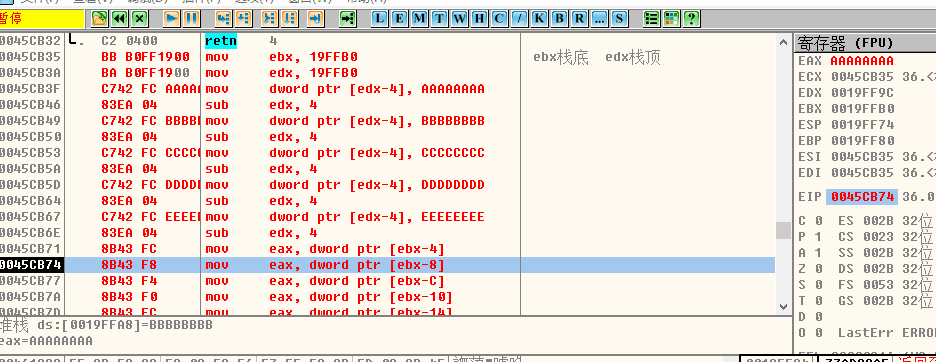 寄存器窗口和汇编窗口的数据存放方式是由高到低