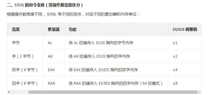 STOS(Store String)直译是 “存储字符串”,它的核心作用是:将累加器(AL/AX/EAX/RAX)中的值,存储到 ES:DI(或 ES:EDI/RDI)指向的内存地址中,并根据方向标志位(DF)自动调整 DI/EDI/RDI 寄存器的值,方便连续存储。